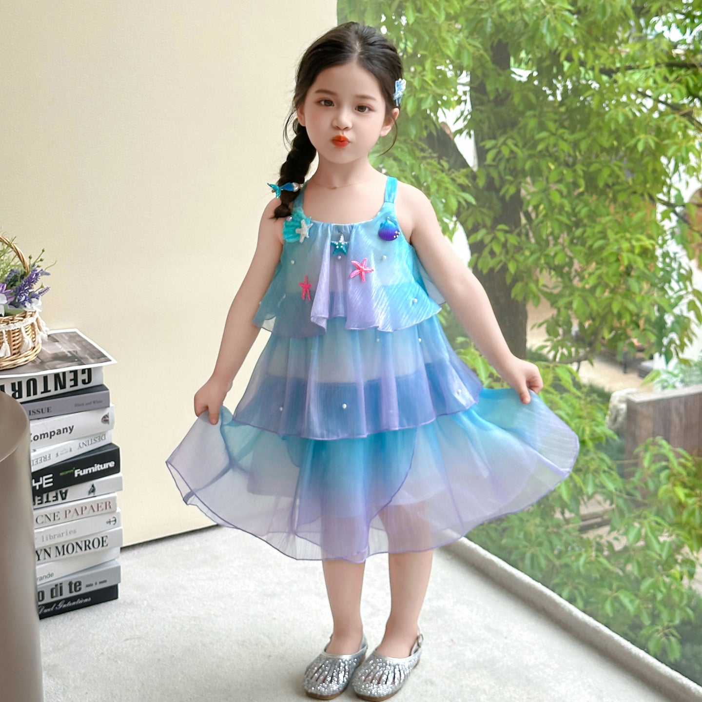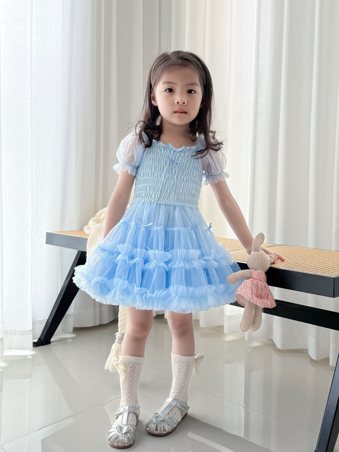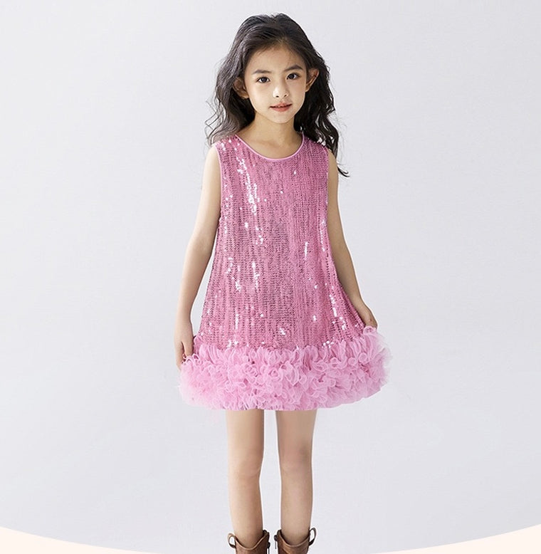 Featuring a sleeveless sequin bodice and a soft A-line tulle skirt adorned with layered floral ruffles, this dress combines comfort with show-stopping style. The lightweight cotton lining ensures breathability for all-day wear, making it ideal for birthdays, photoshoots, and celebrations.