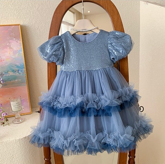 A dazzling blue dress with a glittery sequin bodice, puff sleeves, and layered tulle ruffles for extra volume and charm. Perfect for parties, pageants, or any special occasion where she wants to shine!