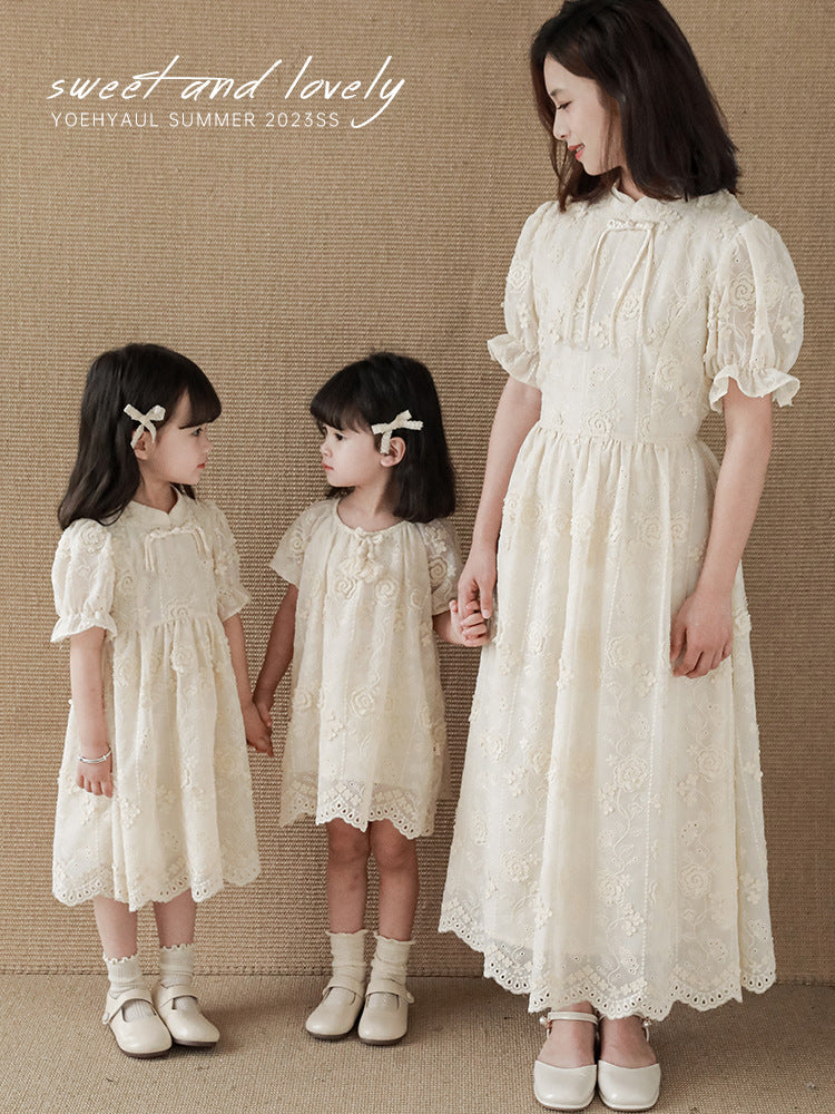 This dress is a beautiful vintage-inspired ivory lace dress, featuring intricate floral embroidery all over. It has puffed short sleeves with a delicate frill trim, a slightly high neckline adorned with a small bow, and a gathered waist that flows into a softly flared skirt. The hemline is scalloped, adding extra elegance and charm.