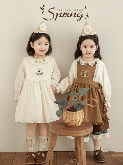 This dress is a sweet, vintage-inspired cream-colored dress featuring delicate embroidered floral patterns throughout. It has a charming scalloped hem, long puffed sleeves with ruffled cuffs, and an adorable bib-style collar trimmed with soft ruffles. The bib is decorated with tiny embroidered bunnies and flowers, giving it a soft, storybook feel.