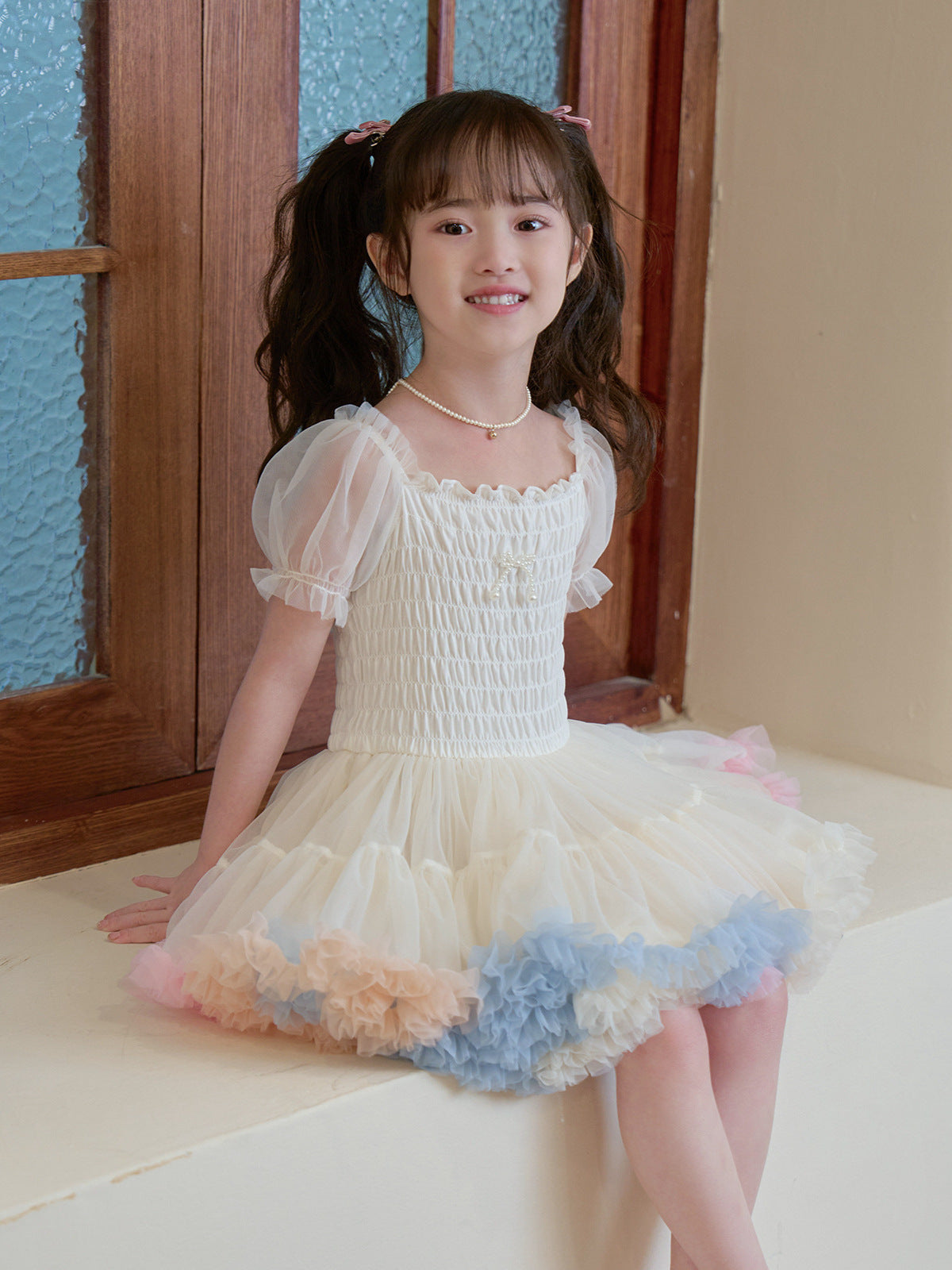 • Bodice: The bodice is shirred, creating a smocked texture, and features a small decorative bow in the center. It has a square neckline with scalloped edges.