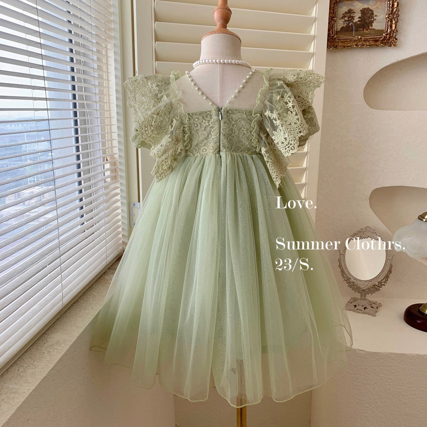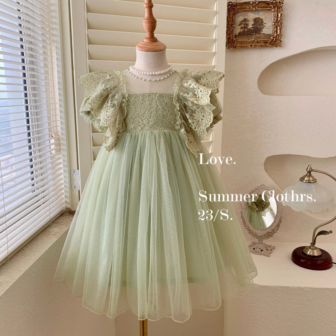 This dress is a stunning light sage green gown, perfect for formal occasions or special events. The bodice features intricate lace detailing, with ruffled lace sleeves that add a touch of vintage charm and elegance. The flowing tulle skirt is soft and ethereal, with a subtle shimmer that adds a magical quality to the dress. The lace overlay and detailed craftsmanship give it a regal, fairy-tale-like appearance, making it an excellent choice for weddings, birthdays, or formal celebrations.